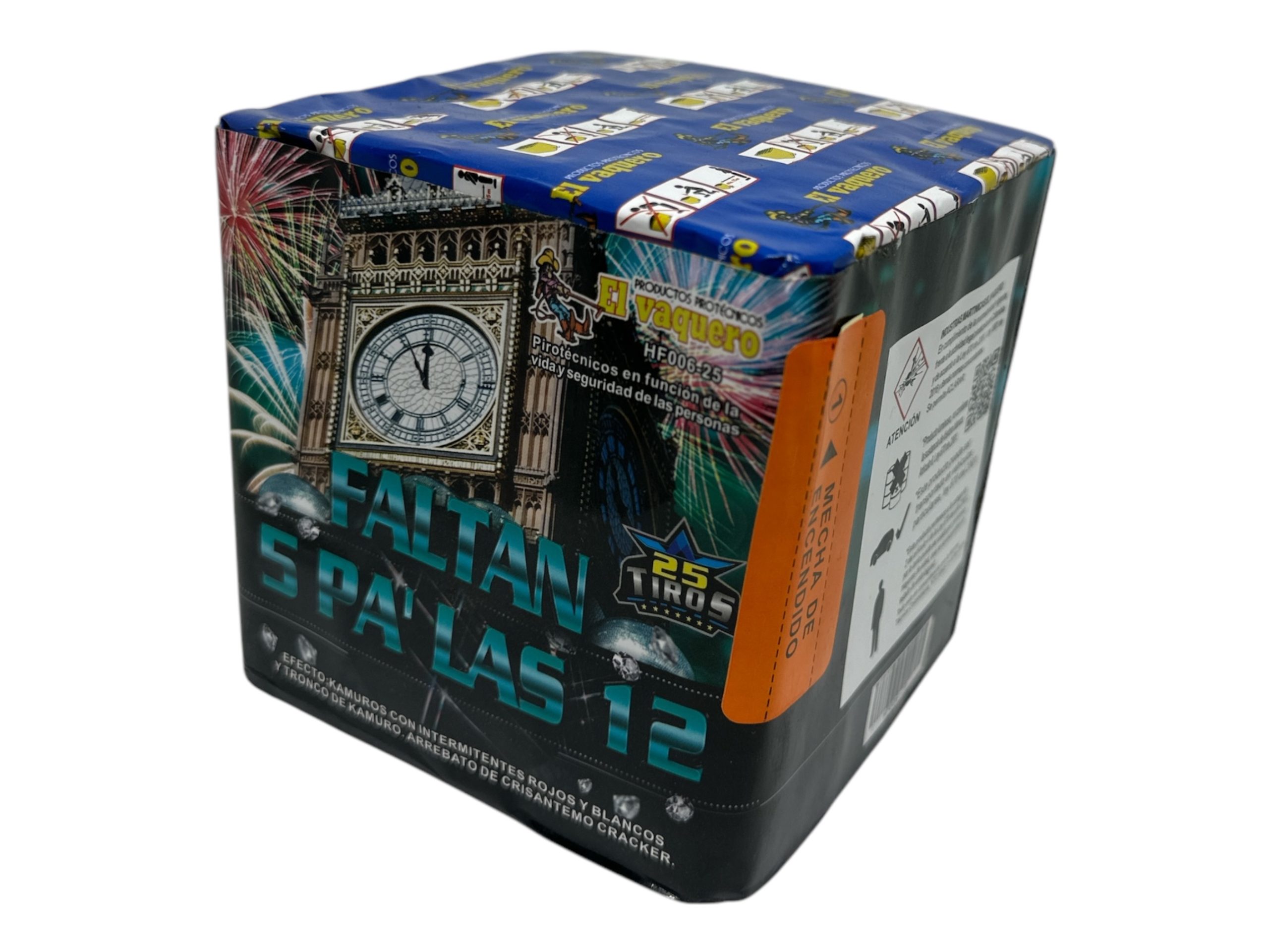¡Haz que tu celebración sea memorable con la Torta 25 tiros Faltan 5 pa’ las 12! Su combinación de efectos y diseño profesional asegura un espectáculo visual de alta calidad para destacar cualquier evento.